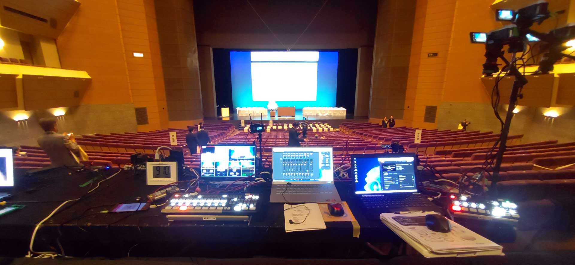ライブ配信を伴わないセミナーの収録と編集の業務ですが、シンプルなセミナー・シンポジウムとは異なる点が何点かあります。今回一番の目玉?は舞台上での実演を近いカメラで会場プロジェクタにも出したいとのことで、そのためにカメラマンに入ってもらっていますがそれ以外はワンオペです。