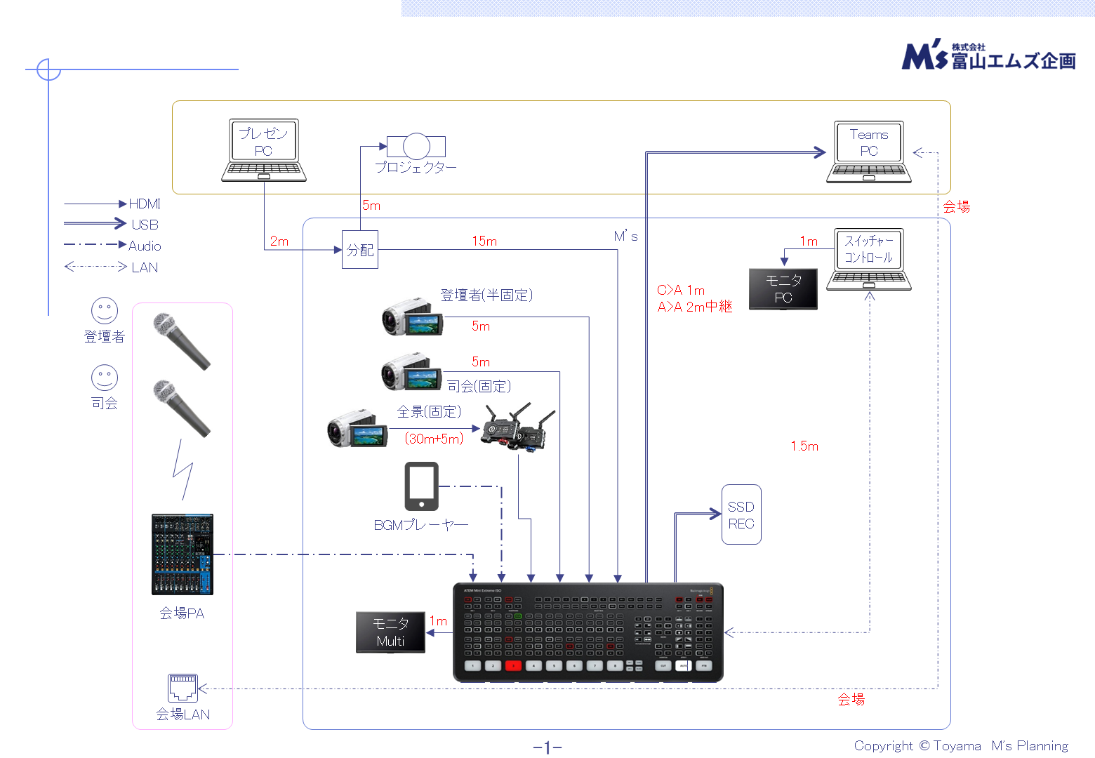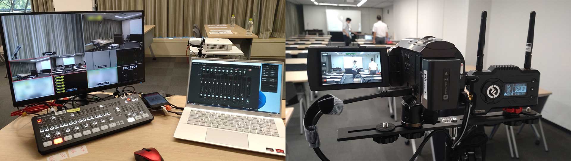 会場後ろから舞台全景の固定、司会用固定、演者用半固定の3台のカメラとプレゼンPCの4映像というごく基本的な構成です。今回縦に細長く座席的には少し窮屈な会議室が会場だったため、全景カメラは無線(Hollyland MARS 400S Pro AC駆動)で飛ばしています。