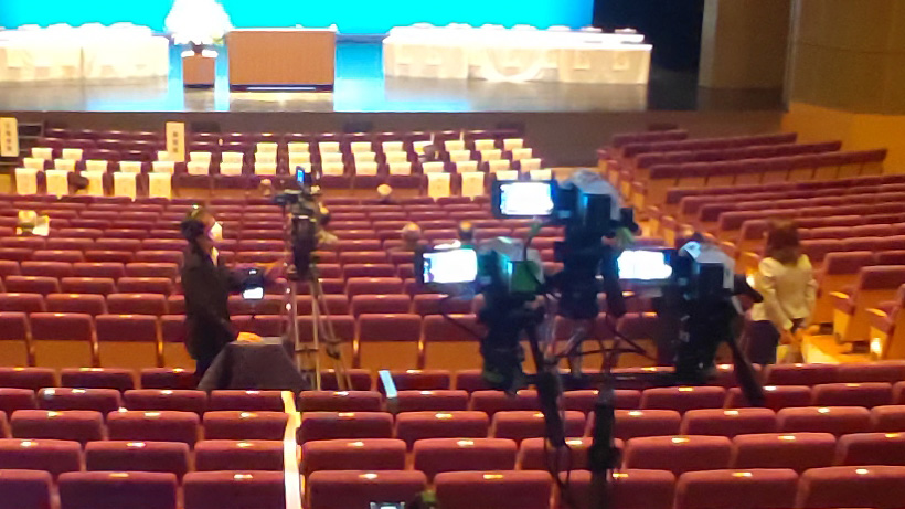 ライブ配信を伴わないセミナーの収録と編集の業務ですが、シンプルなセミナー・シンポジウムとは異なる点が何点かあります。今回一番の目玉?は舞台上での実演を近いカメラで会場プロジェクタにも出したいとのことで、そのためにカメラマンに入ってもらっていますがそれ以外はワンオペです。